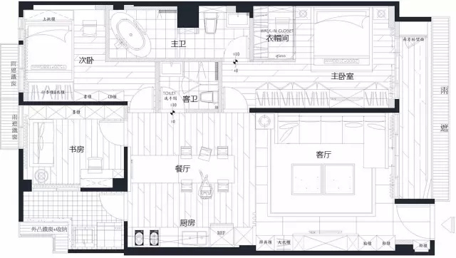上圖是裝修的平面圖,房間一共有主臥、次臥、主衛(wèi)、客衛(wèi)、書房、餐廳、客廳、廚房、衣帽間。