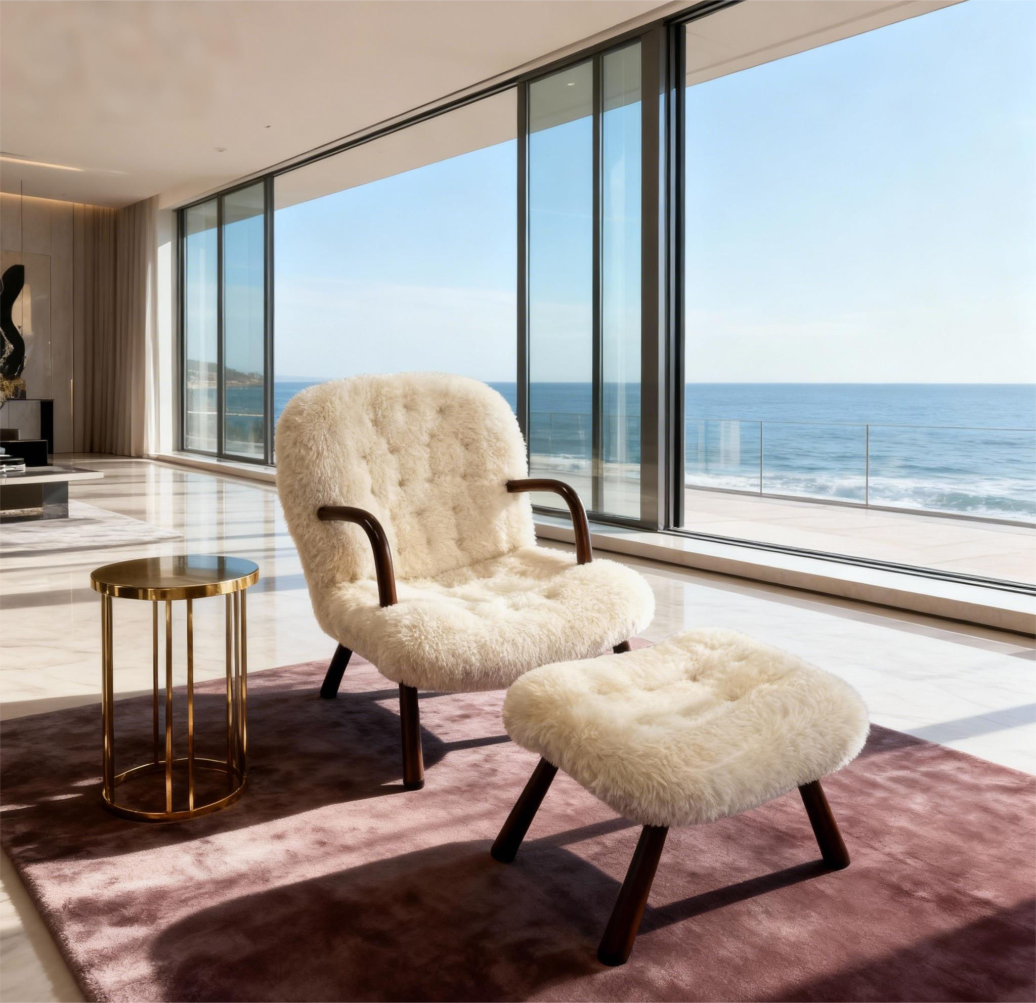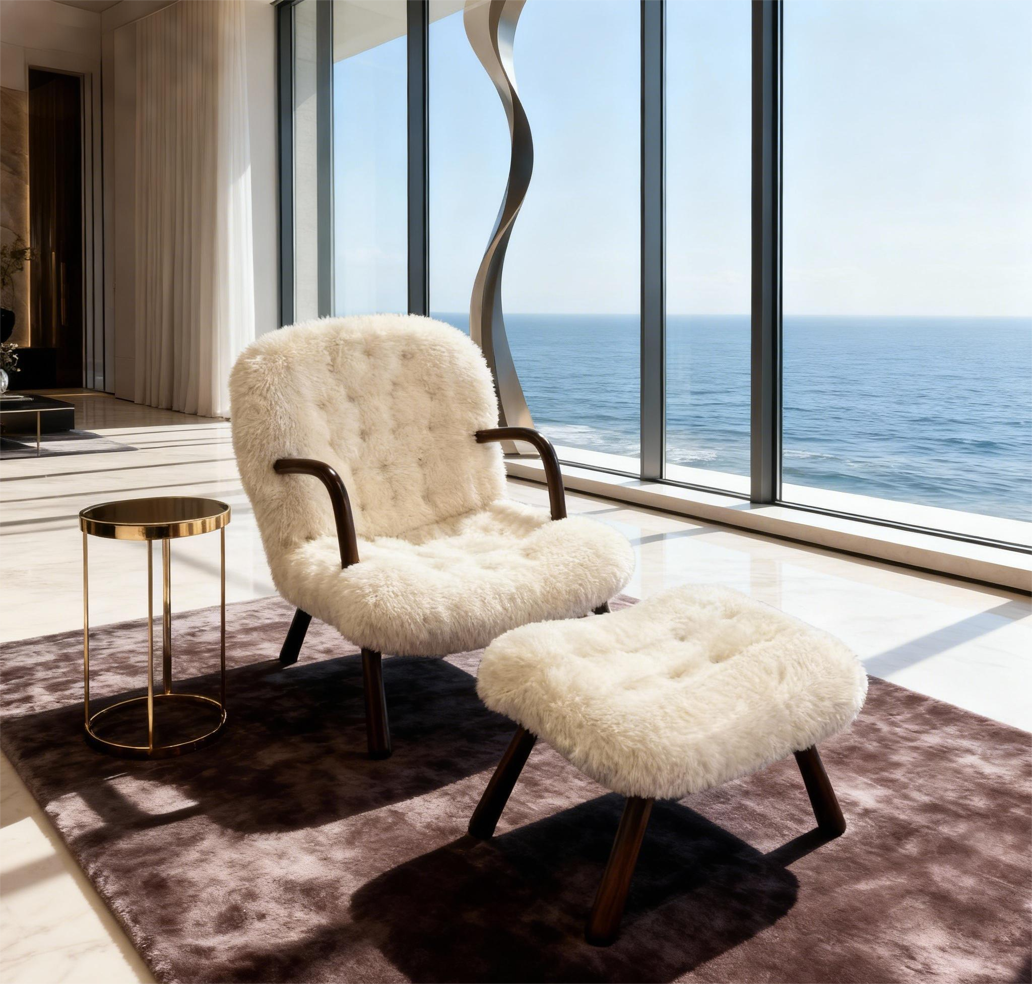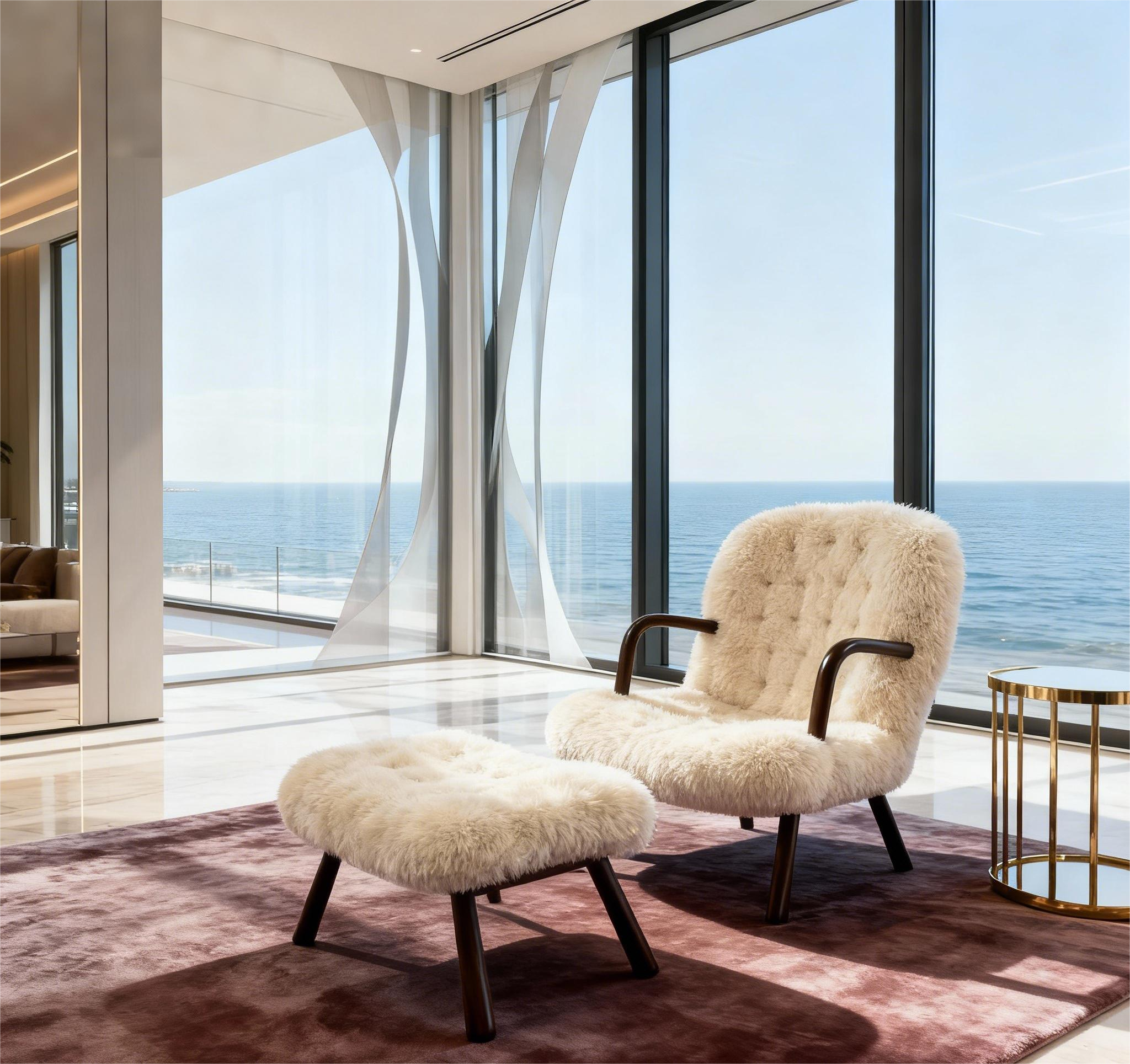 在輕奢風(fēng)的客廳里,擺上一張溫馨的蛤蜊椅,搭配金屬邊幾(如文中實拍圖里的金色小邊幾),再輔以一塊質(zhì)感地毯,瞬間就能提升空間的高級感。比如我們的客戶私宅實拍案例中,一張白色的蛤蜊椅,放在超大落地窗的海景房里,與窗外的藍(lán)海形成呼應(yīng),既顯奢華又充滿生活氣息,完美詮釋了輕奢家具的調(diào)性。
