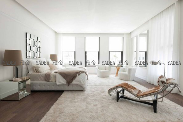 上圖是一個臥室,里面以白色基調(diào)位置,現(xiàn)代家具與百度地毯相結(jié)合,非常高潔、溫馨。