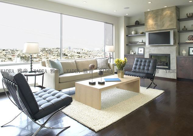 上圖是一個客廳,使用中西結(jié)合的風(fēng)格,以巴塞羅那椅代表現(xiàn)出來的現(xiàn)代風(fēng)格,以實(shí)木壁柜展現(xiàn)出了中國風(fēng)格。