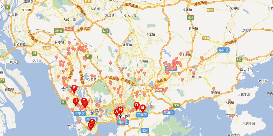 上面是一些知名的家具賣場(chǎng)分布,有些家具賣場(chǎng)沒(méi)在這上面,像我們公司在龍崗和福田都有賣場(chǎng),如果想購(gòu)買產(chǎn)品的可以去這些地方看看,我們公司的聯(lián)系電話為:4000168398,打這個(gè)電話為市內(nèi)免費(fèi)。