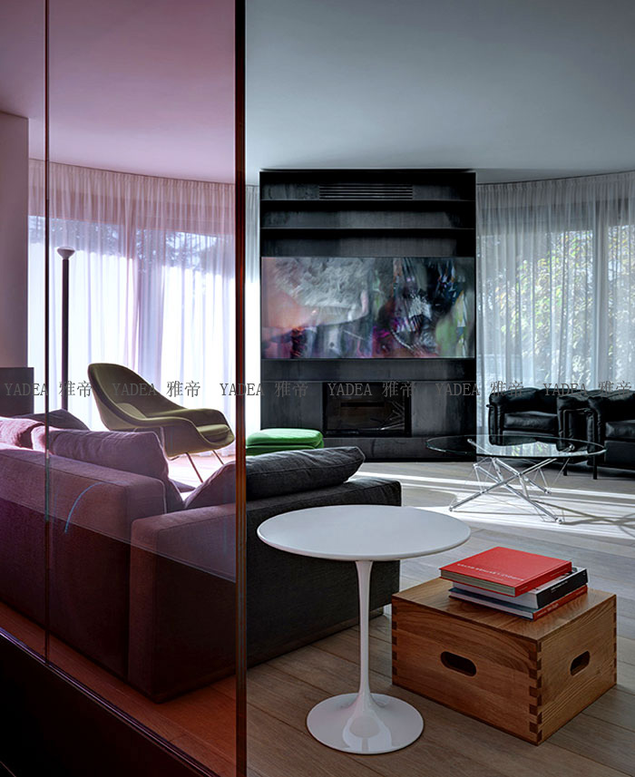 LED顯示屏配在書(shū)柜邊上,在冷硬簡(jiǎn)潔的空間氛圍下,LED電視讓室內(nèi)變得豐富有趣。當(dāng)中的小茶幾與鐵線(xiàn)椅也是時(shí)尚的代表。