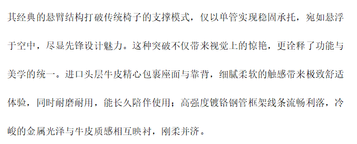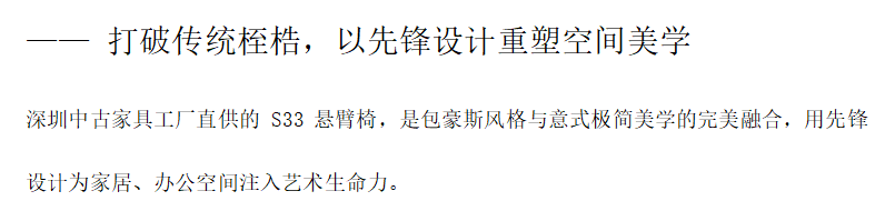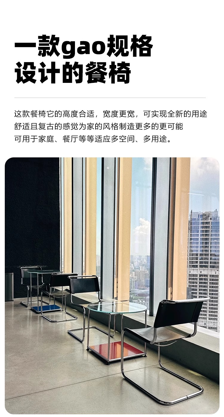 • 產(chǎn)品簡介:深圳中古家具工廠直供的 S33 懸臂椅,以包豪斯風(fēng)格為內(nèi)核,融合意式極簡美學(xué)。經(jīng)典懸臂結(jié)構(gòu)突破傳統(tǒng),單管支撐彰顯先鋒設(shè)計感。進口頭層牛皮包裹座面靠背,觸感柔軟且耐用;高強度鍍鉻鋼管框架線條利落,折射冷峻金屬光澤。工廠直銷模式省去中間環(huán)節(jié),讓高端品質(zhì)以親民價格,為家居、辦公空間注入藝術(shù)氣息
